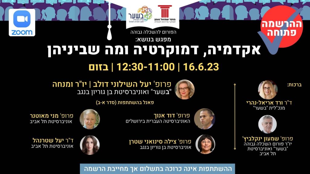 Given the ongoing struggle to define the image and values of the State of Israel as a democratic entity, we will be hosting a discussion on the reciprocal relationship between liberal democracy and academia, particularly in terms of their respective spheres of operation and ethos.