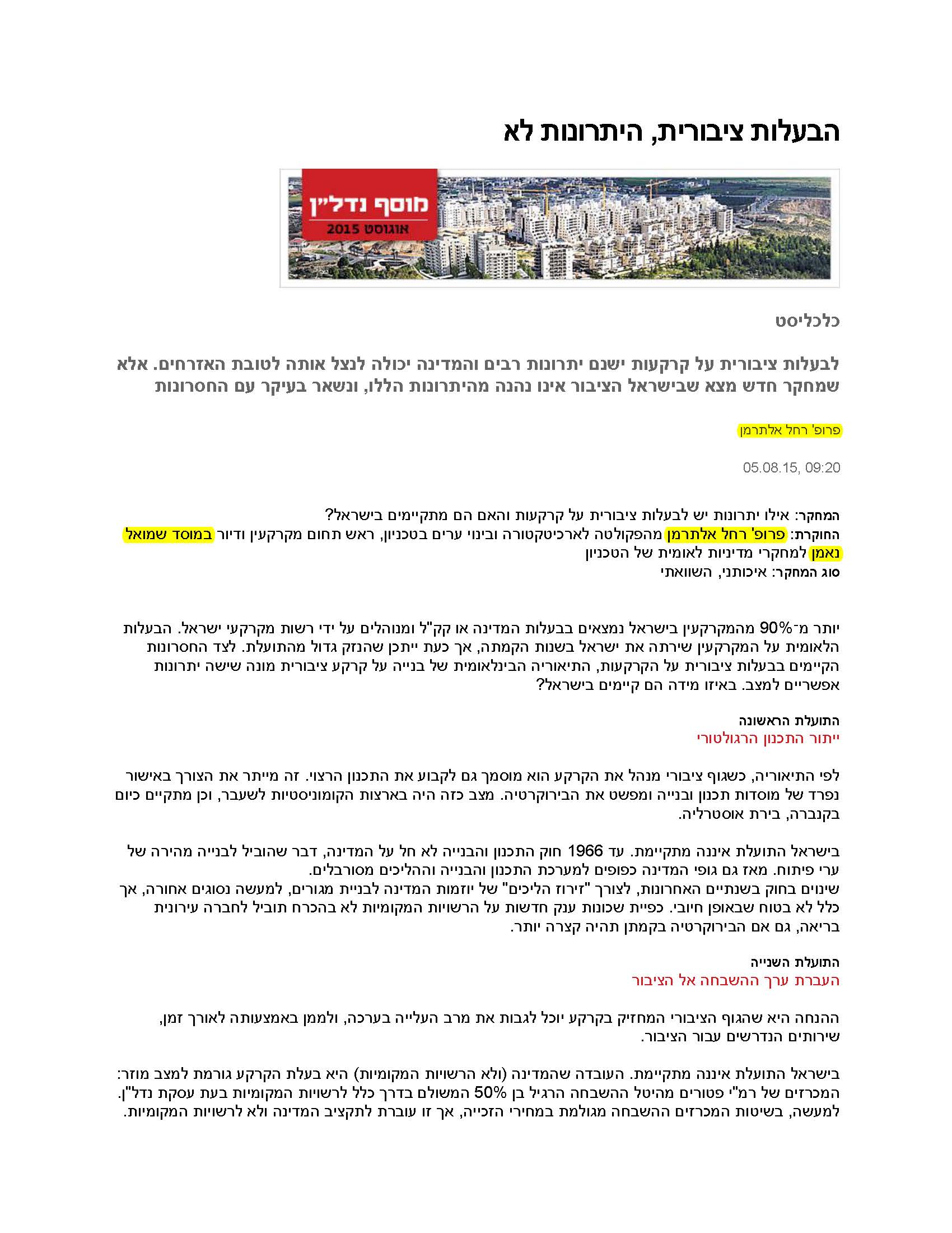 Rachelle Alterman is an active Emeritus Professor of Urban Planning and Law at the Technion’s Faculty of Architecture and Town Planning. As an elected member of the Israel National Academy of Sciences, she has joined the very elite of scholars. Alterman is the Founding President of the International Academic Association on Planning, Law and Property Rights and is an international leader in cross national comparative research that bridges planning and law. The Association of European Schools of Planning has named her an Honorary Member (the only non-European); the Royal Institute of Technology in Stockholm has awarded her the Athena Accolades Award recognizing 10 globally leading academics in urban studies. KTH named her one of 20 Female Athena Accolade recipients. In Israel, she was awarded the prestigious national Landau Scientific Award. Seeking to influence public policy, Alterman serves as advisor to UN Habitat, the OECD, the Union for the Mediterranean, the World Bank, the Israeli Knesset, government bodies, NGOs, and the media.