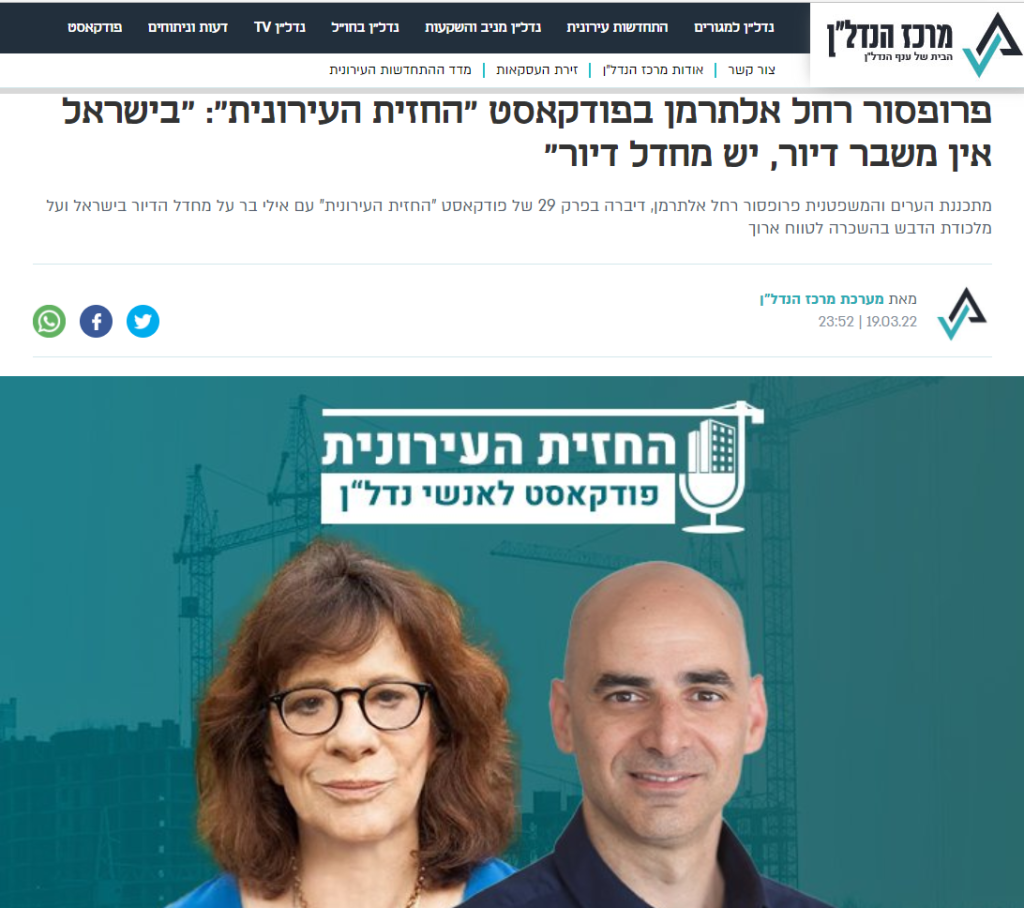 Prof. Rachelle Alterman on the “Urban Front” podcast: “In Israel there is no housing crisis, there is a housing omission”