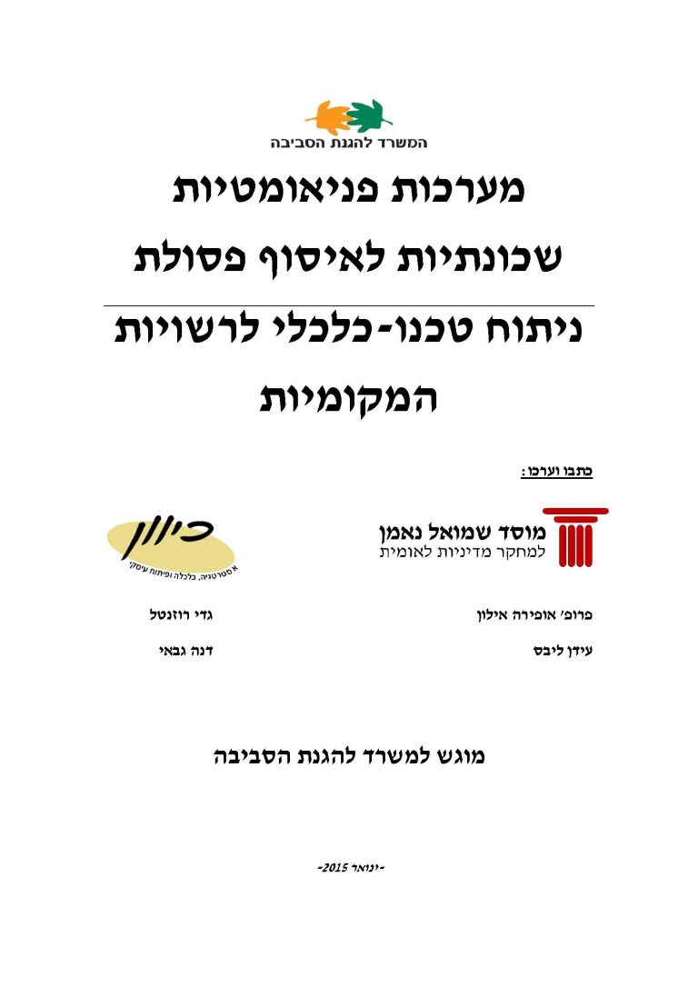 As part of its efforts to improve residential waste collection and treatment, the Ministry of Environmental Protection examines the environmental and economic feasibility of integrating pneumatic refuse collection systems in new, high-density, residential neighborhoods. The goal is to assess the economic benefits of using such systems from the perspective of the waste treatment authorities – meaning the local municipalities. A range of stakeholders are involved in the application of these systems – each with a distinct set of benefits and costs, which are separately analyzed.