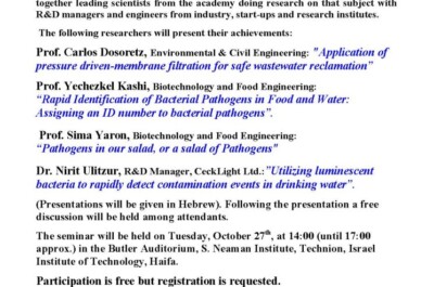הסמינר יערך ביום רביעיי ה-25 לנובמבר 2009 החל מהשעה 14:00. בסמינר יציגו פרופ’ מיכאל אבירם (הפקולטה לרפואה של הטכניון ומרכז רפואי רמב”ם): “הכולסטרול המחומצן ואנטיאוקסידנטים: הכולסטרול הטוב והקשר הפאראאוקסונזי”, פרופ’ יעקב ויה, ( מיג”ל ומכללת