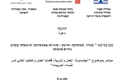 מכללת סכנין להכשרת עובדי הוראה, מוסד נאמן והטכניון מתכבדים להזמינך לכנס בנושא “מגדר, תעסוקה וחינוך: סוגיות בתעסוקה והשכלה בקרב נשים ערביות” אשר ייערך ביום שלישי 9/6/09 , י”ז בסיון תשס”ט באודיטוריום בטלר בטכניון. תוכנית הכנס 9:0