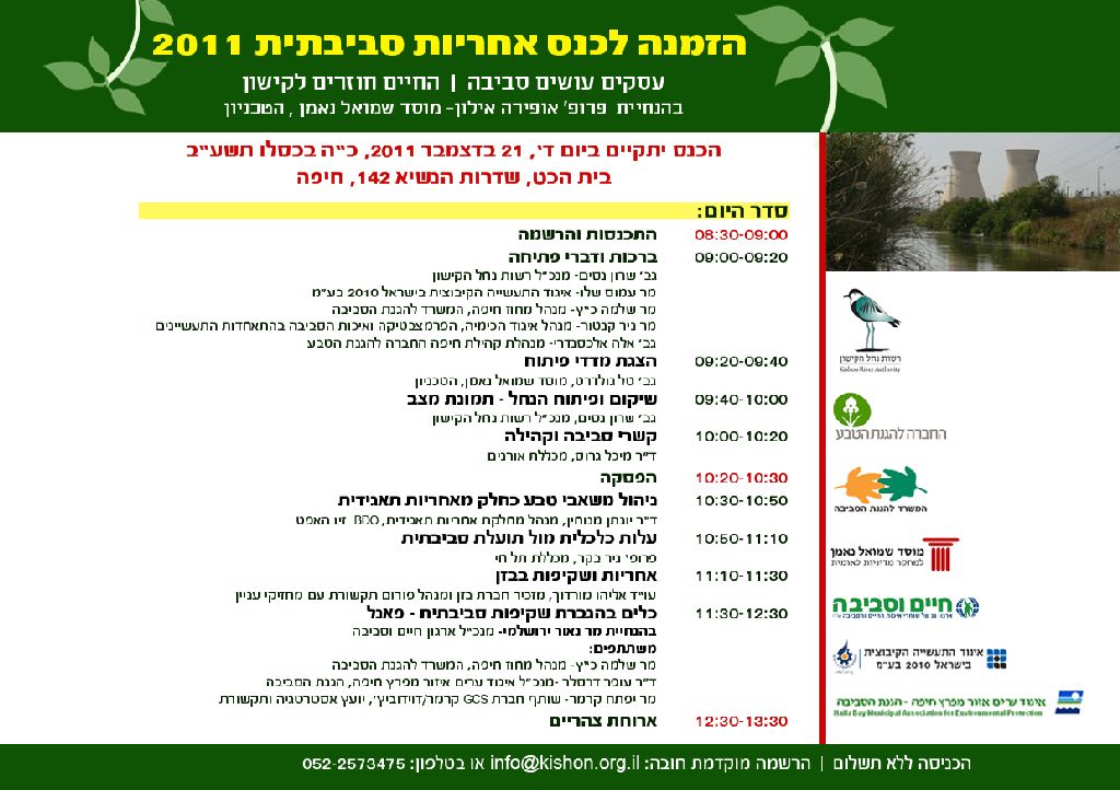 ביום רביעי, 21.12.2011, התקיים כנס רב משתתפים, בנושא “אחריות סביבתית 2011 – עסקים עושים סביבה”, בחיפה. הכנס נערך ביוזמת רשות נחל הקישון, החברה להגנת הטבע ובשיתוף מוסד שמואל נאמן-טכניון, המשרד להגנת הסביבה, ארגון הגג חיים וסביבה, איגוד התעשייה הקיבוצית ואיגוד ערים אזור מפרץ חיפה- הגנת הסביבה. בכנס נכחו נציגי חברות עסקיות ובכירים במגזר הציבורי, אנשי אקדמיה בכירים, נציגי אירגוני הסביבה וקהל רחב, אשר דנו בסוגיות הכרוכות בשיקום ובפיתוח נחל קישון, תוך בחינת מעורבותו הסביבתית והחברתית של המגזר העסקי באזור חיפה והמפרץ. הנושא של אחריות תאגידית נדון בהרחבה בכנס.