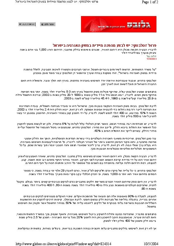 פרופ' זסלבסקי: יש לבצע מהפכה מיידית במשק האנרגיה בישראל
