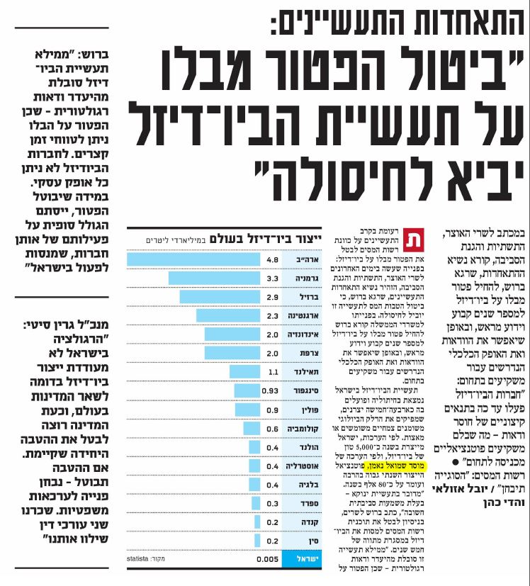 התאחדות התעשיינים: "ביטול הפטור מבלו על תעשיית הביו-דיזל יביא לחיסולה"