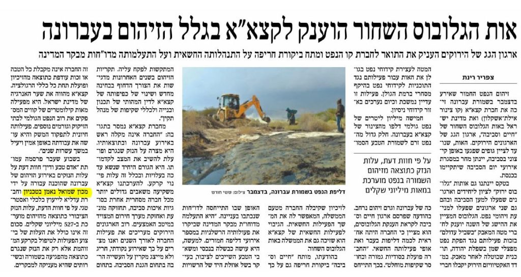 אות הגלובוס השחור הוענק לקצא"א בגלל הזיהום בעברונה