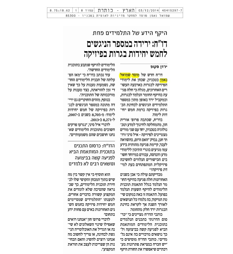 דו"ח: ירידה במספר הניגשים לחמש יחידות בגרות בפיזיקה