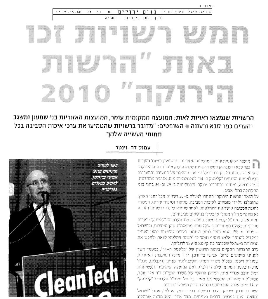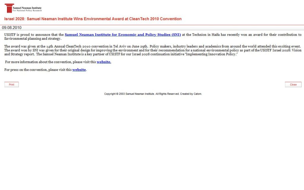 ישראל 2028: מוסד שמואל נאמן זוכה פרס איכות הסביבה של אמנת קלינטק 2010