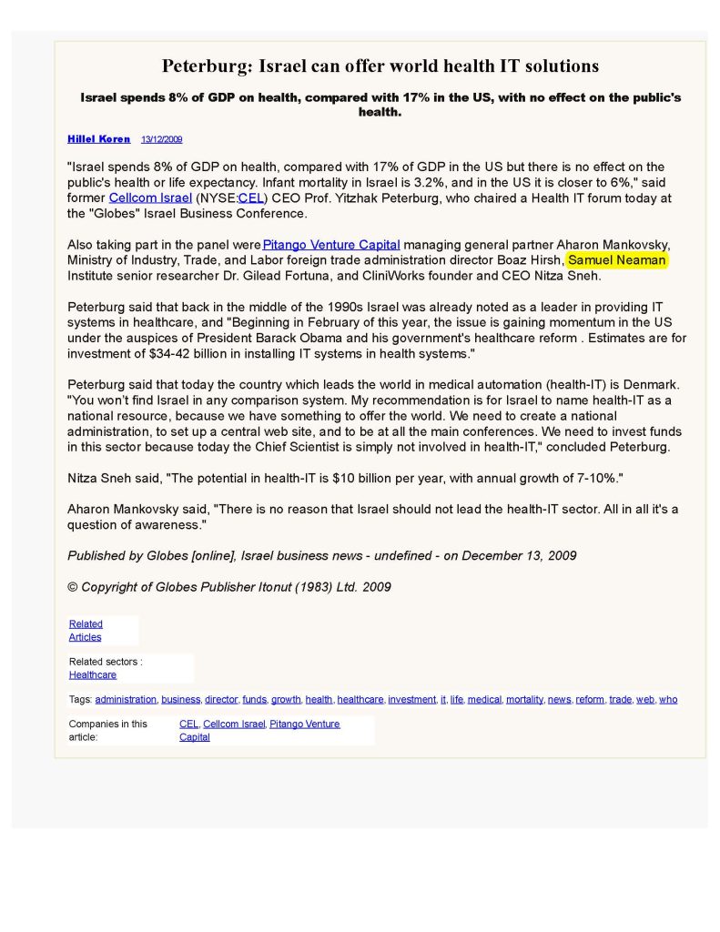 פטרבורג: ישראל יכולה להציע פתרונות ממוחשבים בנושא הבריאות לעולם