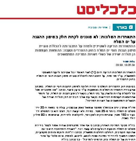 התאחדות המלונות: לא מוכנים לקחת חלק במימון ההגנה על ים המלח