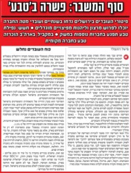 ידיעה זאת מסקרת את ההסכם בין חברת “טבע” לוועד העובדים של החברה, שבמסגרתו יושהו חלק מהפיטורים, כך שיובטח מקום עבודתם של חלק מהעובדים שבסכנת פיטורים, למשך השנתיים הקרובות.
