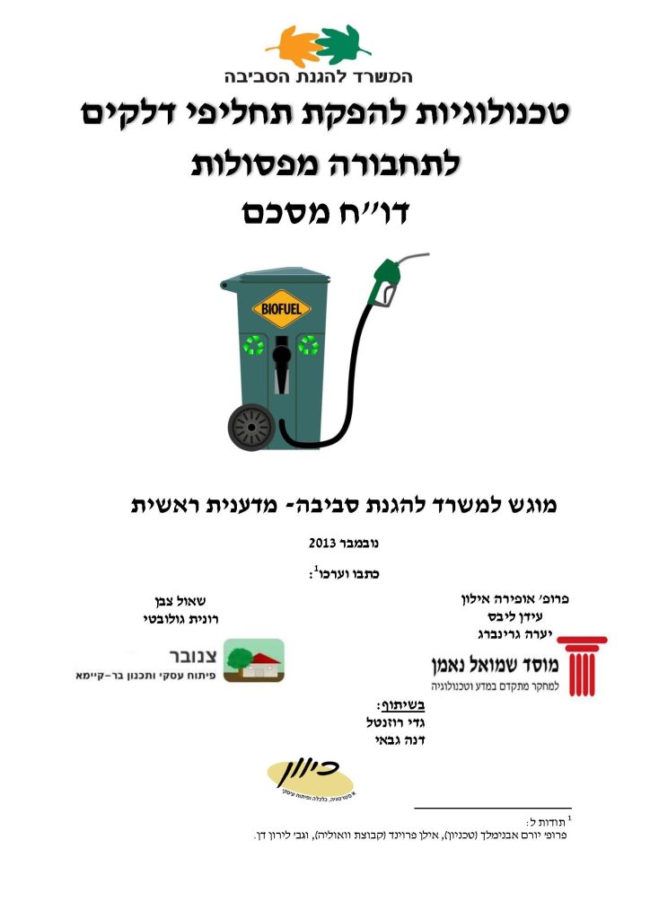 טכנולוגיות להפקת תחליפי דלקים לתחבורה מפסולות – דו”ח מסכם